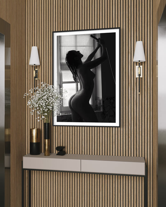 Immerse yourself in the world of luxury and sensuality with our exclusive art print "Silhouette in the Shower". This captivating piece showcases the striking contrast of a woman's silhouette under the shower in a luxurious Parisian hotel. The play of shadow and light creates an alluring and mysterious atmosphere, capturing the essence of elegance and intimate luxury.